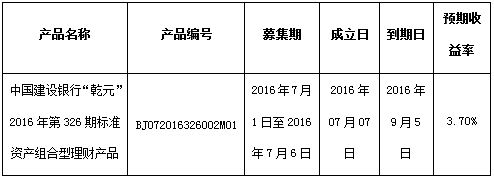 中国建设银行“乾元”2016年第326期标准资产组合型理财产品成立公告