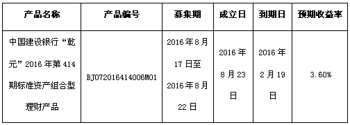 中国建设银行“乾元”2016年第414期标准资产组合型理财产品成立公告