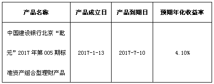 关于中国建设银行北京“乾元”2017年第005期标准资产组合型理财产品成立的公告