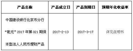 关于中国建设银行北京市分行“乾元”2017年第021期保本型法人人民币理财产品成立的公告