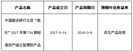 关于中国建设银行北京“乾元”2017年第734期标准资产组合型理财产品成立的公告