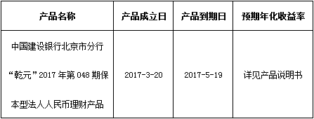 关于中国建设银行北京市分行“乾元”2017年第048期保本型法人人民币理财产品成立的公告