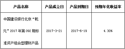 关于中国建设银行北京“乾元”2017年第092期标准资产组合型理财产品成立的公告