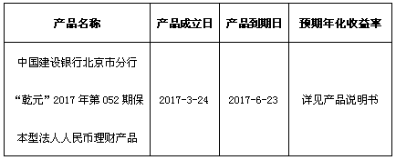 关于中国建设银行北京市分行“乾元”2017年第052期保本型法人人民币理财产品成立的公告