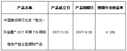 关于中国建设银行北京“乾元-升益鑫”2017年第739期标准资产组合型理财产品成立的公告