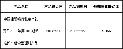 关于中国建设银行北京“乾元”2017年第101期标准资产组合型理财产品成立的公告