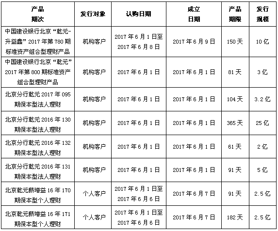 中国建设银行北京市分行定于2017年6月1日发行理财产品,现将相关发行情况公告如下: