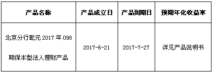 关于北京分行乾元2017年098期保本型法人理财产品成立的公告