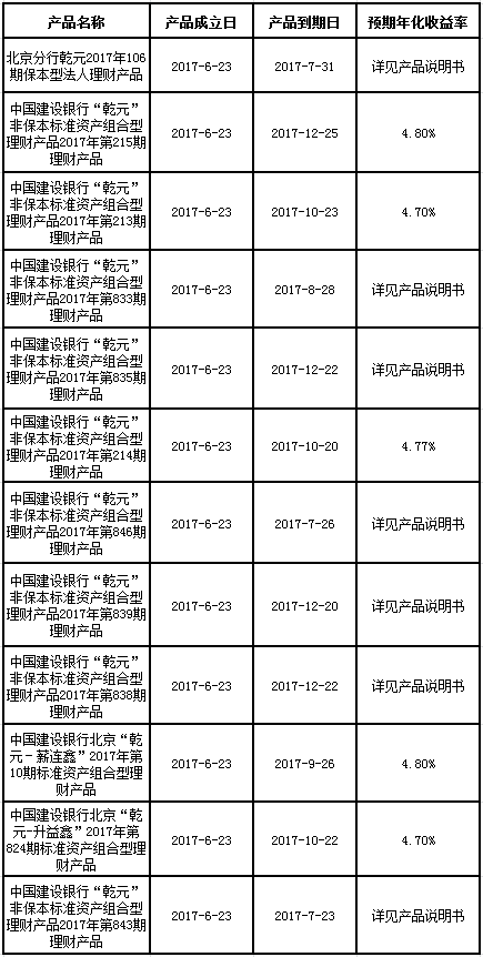 根据与投资者的约定,现将建行北京市分行2017年6月23日理财产品成立情况信息进行披露: