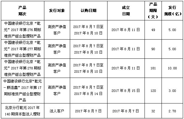 中国建设银行北京市分行定于2017年8月7日发行理财产品,现将相关发行情况公告如下: