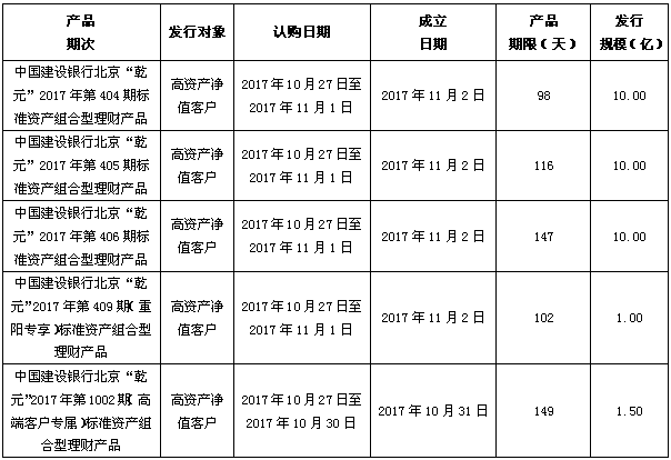 中国建设银行北京市分行定于2017年10月27日发行理财产品,现将相关发行情况公告如下: