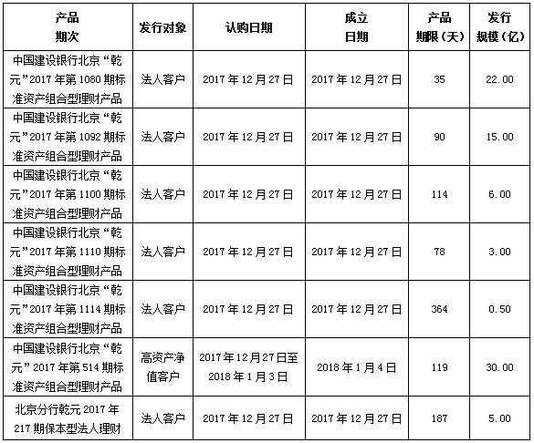建行北京市分行理财产品发行公告2017年12月27日
