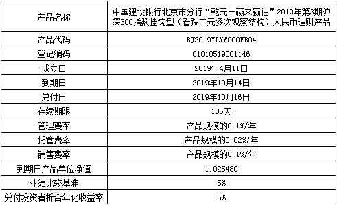 中国建设银行北京市分行“乾元—赢来赢往”2019年第3期沪深300指数挂钩型(看跌二元多次观察结构)人民币理财产品终止及清算公告