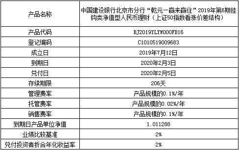 中国建设银行北京市分行“乾元—赢来赢往”2019年第6期挂钩类净值型人民币理财产品(上证50指数看涨价差结构)终止及清算公告