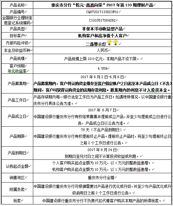 1.本期产品规模上限:10.0亿元。在本期产品募集期内,对本期产品的认购金额达到本期理财产品规模上限,则中国建设银行重庆市分行有权利但无义务停止本期产品的认购,已经认购成功的客户投资权益不受影响。