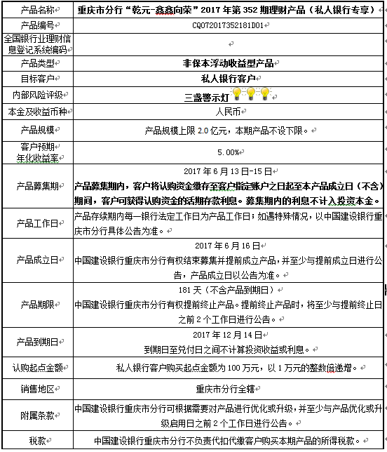中国建设银行重庆市分行“乾元-鑫鑫向荣” 2017年第352期理财产品风险揭示书和产品说明书