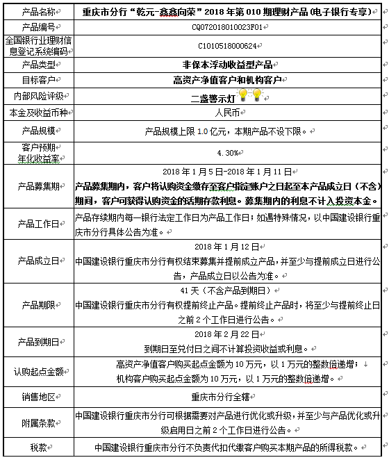 3.中国建设银行重庆市分行可根据市场情况等调整产品规模上、下限,并最迟于调整规模上下限当日进行公告。