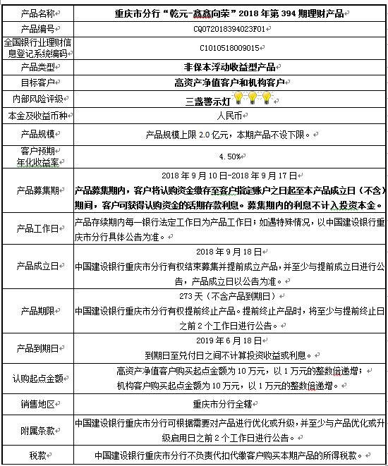 中国建设银行重庆市分行“乾元-鑫鑫向荣” 2018年第394期理财产品风险揭示书和产品说明书