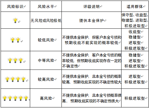 本产品为非保本浮动收益型理财产品,不保证本金和收益,请您充分认识投资风险,谨慎投资。本期产品期限110天(中国建设银行有权对产品进行展期或提前终止),存续期内,产品不接受申购或赎回申请。本期产品内部风险评级级别为盏警示灯,风险水平属于中等风险。最不利情况下,您将损失全部收益甚至包括全部本金。本理财产品适用于稳健型进取型 积极进取型客户。