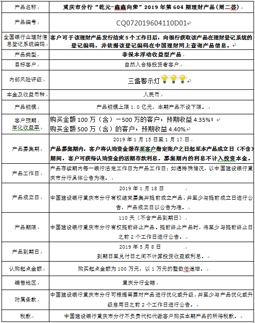 中国建设银行重庆市分行“乾元-鑫鑫向荣” 2019年第604期理财产品风险揭示书和产品说明书