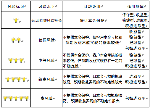 本产品为非保本浮动收益型理财产品,不保证本金和收益,请您充分认识投资风险,谨慎投资。本期产品期限为149天(中国建设银行有权对产品进行展期或提前终止),存续期内,产品不接受申购或赎回申请。本期产品内部风险评级级别为盏警示灯 ,风险水平属于较低风险。最不利情况下,您将损失全部收益甚至包括全部本金。本理财产品适用于收益型、稳健型、进取型 积极进取型客户。