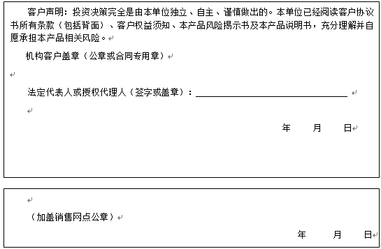 客户签名:                                    客户声明:投资决策完全是由客户独立、自主、谨慎做出的。客户已经阅读客户协议书所有条款(包括背面)、客户权益须知、本产品风险揭示书及本产品说明书,充分理解并自愿承担本产品相关风险。)