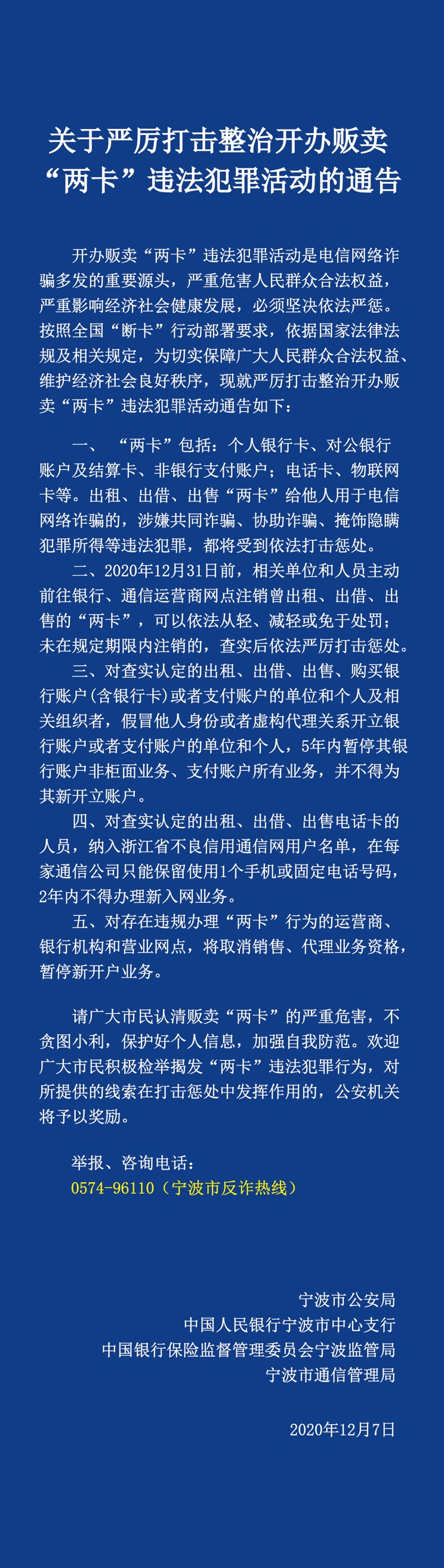 关于严厉打击整治开办贩卖“两卡”违法犯罪活动的通告