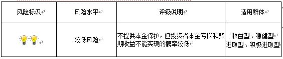 本期产品为非保本浮动收益型理财产品,不保证本金和收益,请您充分认识投资风险,谨慎投资。本期产品期限118天(中国建设银行有权对本期产品进行展期和提前终止),存续期内产品不接受申购或赎回申请。本期产品内部风险评级级别为2盏警示灯 ,风险程度属于较低风险。最不利情况下,资产组合无法回收任何本金和净收益,客户将损失全部本金。产品适合于收益型、稳健型、进取型、积极进取型客户。