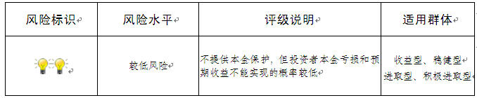 本期产品为非保本浮动收益型理财产品,不保证本金和收益,请您充分认识投资风险,谨慎投资。本期产品期限147天(中国建设银行有权对本期产品进行展期和提前终止),存续期内产品不接受申购或赎回申请。本期产品内部风险评级级别为2盏警示灯 ,风险程度属于较低风险。最不利情况下,资产组合无法回收任何本金和净收益,客户将损失全部本金。产品适合于收益型、稳健型、进取型、积极进取型客户。