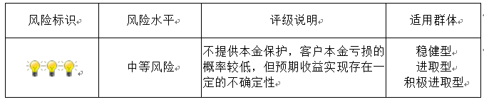 本期产品内部风险评级级别为三盏警示灯 ,风险程度属于中等风险。产品适合于稳健型、进取型及激进型客户。最不利情况下,基础资产无法回收任何本金和收益,客户将损失全部本金。客户不得使用贷款、发行债券等筹集的非自有资金投资本产品。