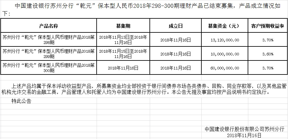 中国建设银行苏州分行“乾元”保本型人民币2018年298-300期