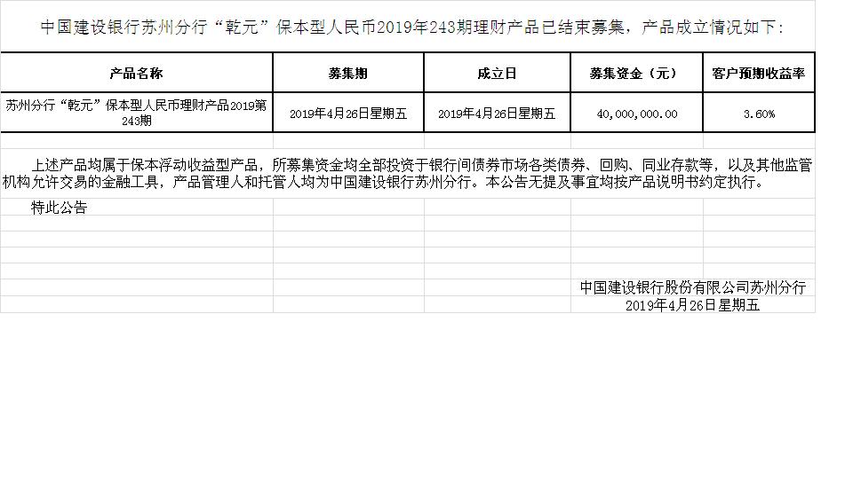 中国建设银行苏州分行“乾元”保本型人民币2019年243期理财产品成立公告